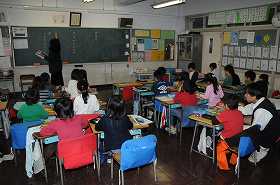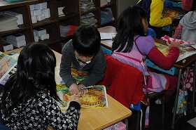 算数の教科書の2枚の挿絵を見比べて、間違いの数を見つけています。