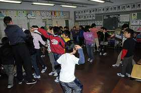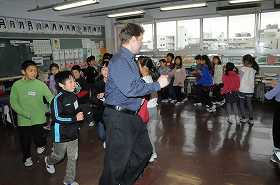 英語の指示に従って、歩いたり、走ったり、スキップしたり、笑ったりしています。