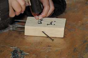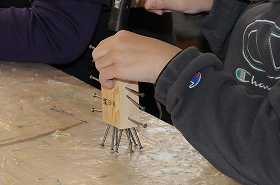「カクカクともだち」をテーマに、くぎうちを使って、木材を組み合わせながら友だちを作っています。