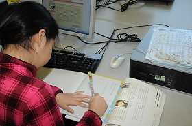 コンピュータを使って、仕事リーフレットを作るための資料を検索し調べています。