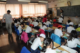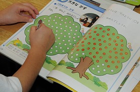 大きな数の導入として、時間を決めて教科書のりんごの木に色塗りをしています。