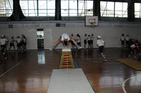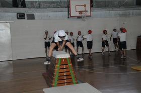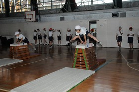 跳び箱を跳ぶ練習をしています。