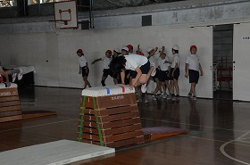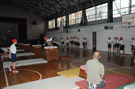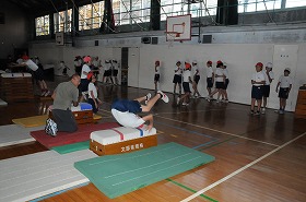 跳び箱を跳ぶ練習をしています。