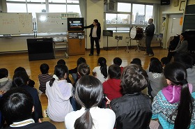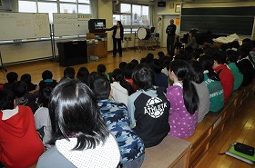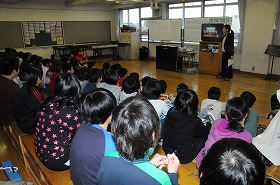 朝の練習のビデオを見ながら、6年生からのアドバイスを確認し、自分たちの課題を確認しています。