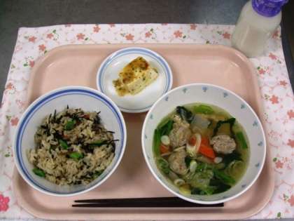今日の給食は、ひじきごはん・とびうおのつみれ汁・豆腐のみそマヨ田楽・牛乳でした。