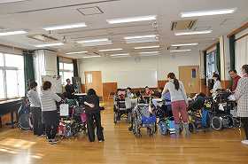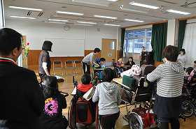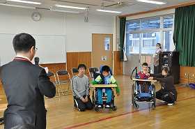光明特別支援学校との交流会が始まります。校長先生のお話を聞いています。