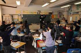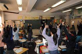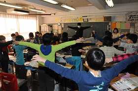 「人の体のつくりと運動」の導入で、簡単な体の動きを実際にやっています。