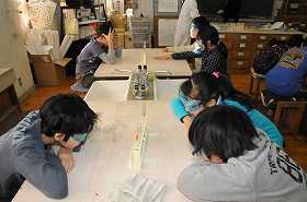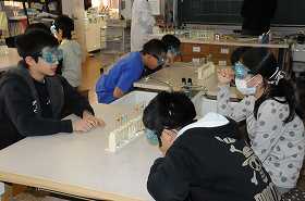 金属を溶かす水溶液を調べる実験をしています。金属の変化を見逃さないように集中して観察しています。