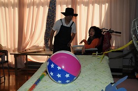 紙芝男先生による「おむすびころりん」の紙芝居を見た後で、おむすびの代わりにビーチボールをネズミさんに届けるゲームをしています。