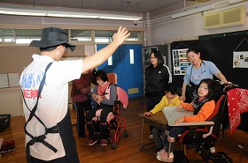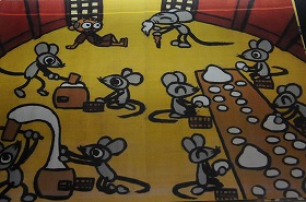 紙芝男先生による「おむすびころりん」の紙芝居を見た後で、おむすびの代わりにビーチボールをネズミさんに届けるゲームをしています。