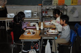 1年2組の子どもたちが給食を食べています。後期の前半も間もなく終わりますが、すっかり給食にも慣れました。