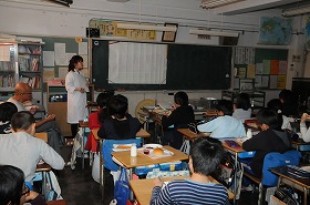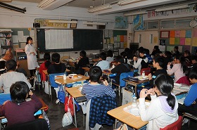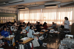 給食の時間に、給食で使う食材の地産地消の話を栄養士から聞いています。