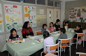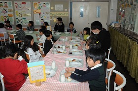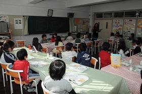 今日は1年1組の子どもたちがランチルームで給食を食べています。