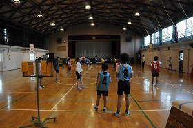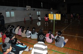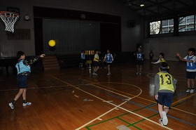 ハンドボールのゲームをしています。今日は3年生が見学しています。