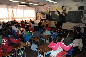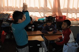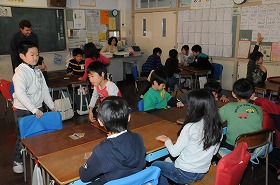 スポーツにかかわるカードを使い、ジェスチャーで当てるゲームを班ごとに行っています。