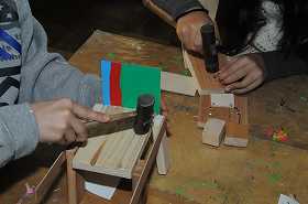 「カクカクともだち」をテーマに、木材を組み合わせて楽しい友だちを作っています。
