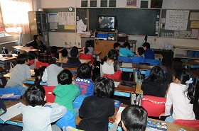 わかたけ学級との交流会を行う前に、1組の交流会の様子をビデオで見ています。