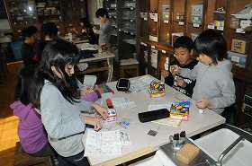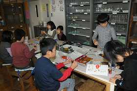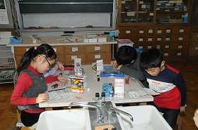 乾電池、どう線、ソケット、豆電球を使って明かりをつける実験をしています。