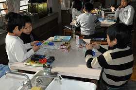 乾電池、どう線、ソケット、豆電球を使って明かりをつける実験をします。