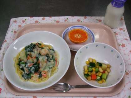 今日の給食は、スパゲティーサーモンソース・コロコロサラダ・果物(みかん)・牛乳でした。