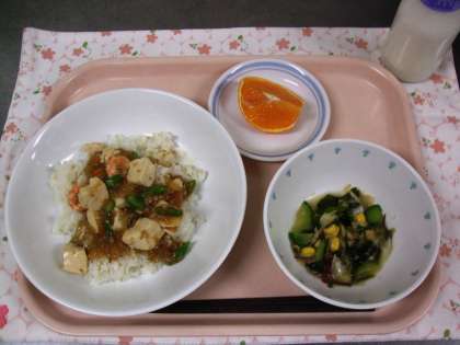 今日の給食は、ご飯・豆腐の華風煮・ミネラルサラダ・果物(紅マドンナ)・牛乳でした。