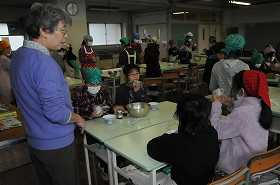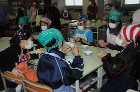食べることの大切さを、栄養素のはたらきで考えます。今日はエネルギーになる栄養素としてのご飯をおにぎりにしています。できあがった班から試食しています。
