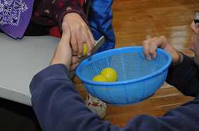 チーム対抗的あてゲームの結果を確かめています。