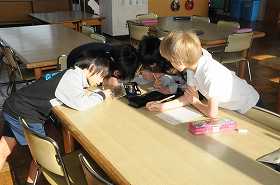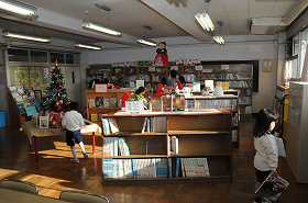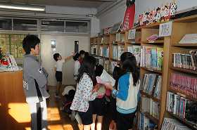 実際に図書室で、どの本がどの棚に収められているかを調べています。