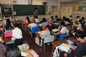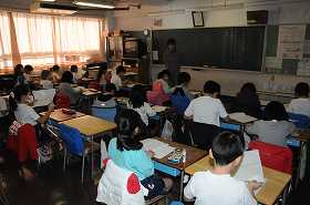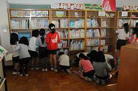 図書室のどの本がどの棚に収められているかを調べます。その準備をしています。