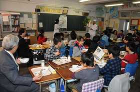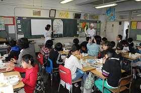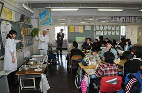 目黒区農業振興運営協議会より、給食食材として12月に大根が区内の小中学校へ無償提供されました。各学校では食育をはじめ地産地消や都市農地を理解する機会として提供された大根を活用しています。今回、その状況を視察するために、目黒区長、教育長、産業経済課長、JA世田谷目黒、目黒区農業振興運営協議会の皆様10名が、本校の給食を視察されるとともに子どもたちといっしょに給食を食べてくださいました。写真は、いただいた大根について、栄養士が説明しているところです。