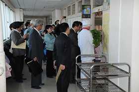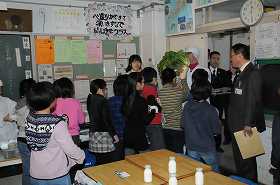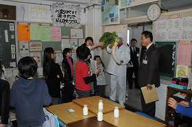 目黒区農業振興運営協議会より、給食食材として12月に大根が区内の小中学校へ無償提供されました。各学校では食育をはじめ地産地消や都市農地を理解する機会として提供された大根を活用しています。今回、その状況を視察するために、目黒区長、教育長、産業経済課長、JA世田谷目黒、目黒区農業振興運営協議会の皆様10名が、本校の給食を視察されるとともに子どもたちといっしょに給食を食べてくださいました。写真は、各教室を回り大根を子どもたちに紹介しているところです。