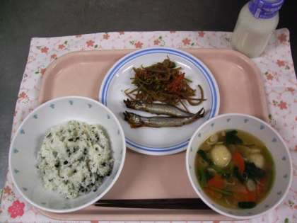 今日の給食は、わかめご飯・焼きししゃも・五目きんぴら・いも団子汁・牛乳でした。