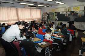英語の説明を聞きながら、物を作る作業をしています。
