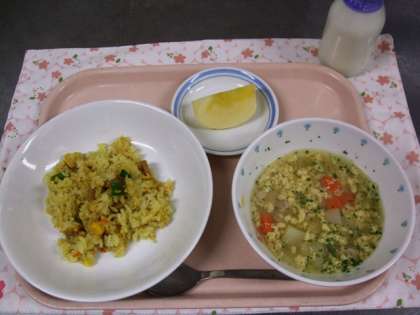 今日の給食は、カレーピラフ・ふわふわスープ・果物(りんご)・牛乳でした。