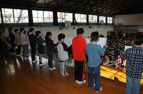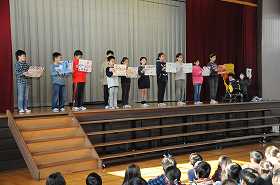 今日のなの花タイムは、来週おこなう「なの花まつり」での、各学級のお店をPRする集会です。