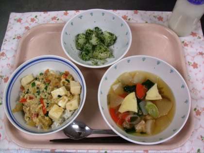 今日の給食は、豆腐と卵のどんぶり・せんべい汁・磯かポテト・牛乳でした。