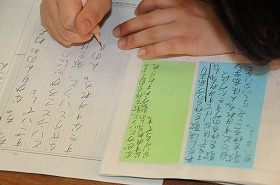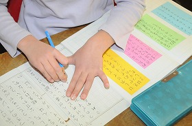 「わたしはおねえさん」の感想文を色別に内容を整理したカードを使って書いています。