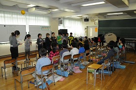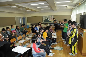 リコーダーを使って「茶色の小びん」をグループごとに発表しています。