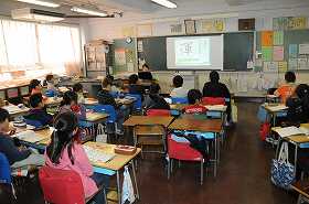 漢字の書き順をコンピュータを使って確認し、空書きした後で実際に書いて練習しています。