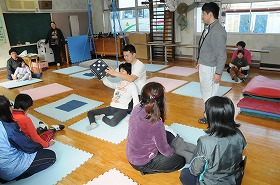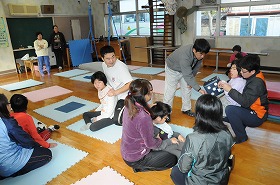 中学生と6年生が合同で巨大すごろくをしています。