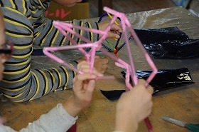 「空をおよぐ魚」をテーマに、ストロー、モール、セロハンを使って作品を作っています。