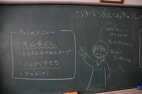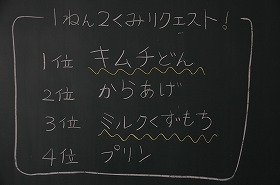 今日は1年2組の子どもたちがランチルームで給食を食べます。献立は、1年2組のリクエストによるものです。