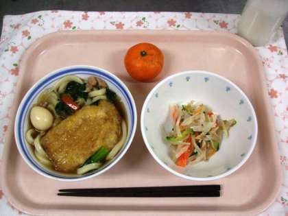 今日の給食は、力うどん・大根サラダ梅肉ソース・くだもの(みかん)・牛乳でした。