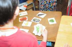 果物と野菜のカードを使い、色を言ってその色の果物や野菜があるかどうかを答えるゲームをしています。