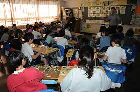 果物と野菜のカードを使い、色を言ってその色の果物や野菜があるかどうかを答えるゲームをします。まず、A班が机にカードを並べ、B班が質問をします。