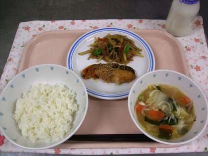 今日の給食は、ご飯・鰆のみそ漬け焼き・じゃがいもの金平・冬野菜のみそ汁・牛乳でした。