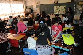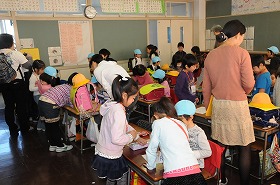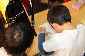 1年生が年長さんにランドセルを背負わせてあげたり、簡単な絵を書かせてあげたり、あやとりを一緒にしたりして交流しています。