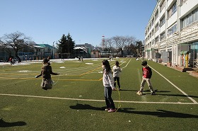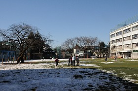 中休みに、雪の残る校庭で子どもたちが遊んでいます。