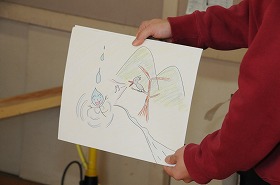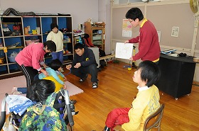 音楽の中に出てくる音を、楽器以外の物を使って表現します。風船の空気を体で押し出し、鳥笛を鳴らして鳥の声を表現する練習を交代でしています。