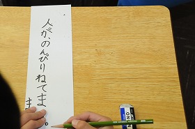 様子を表す言葉を含んだ文を教科書から選び、カードに書いています。